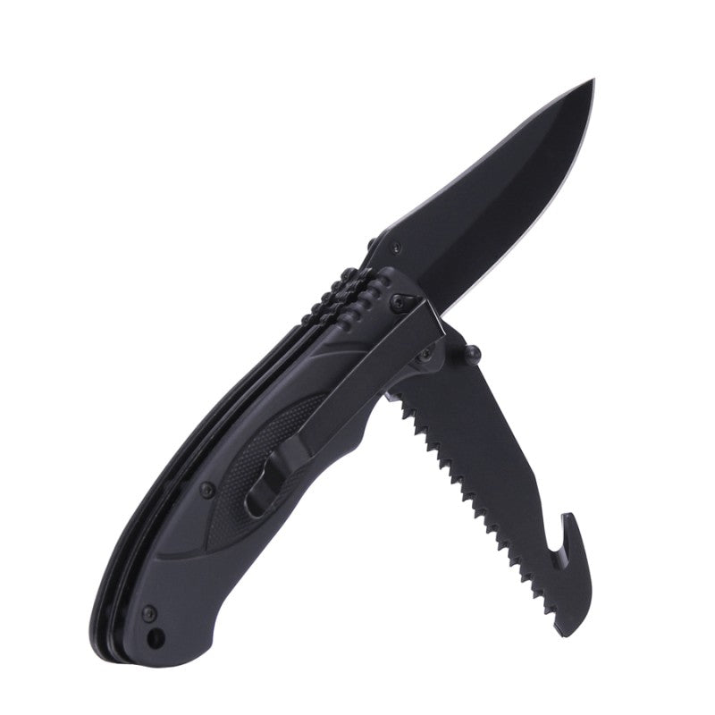 Dit Fosco Bushcraft mes is voorzien van twee roestvrijstalen mesbladen met inklapbeveiliging. |